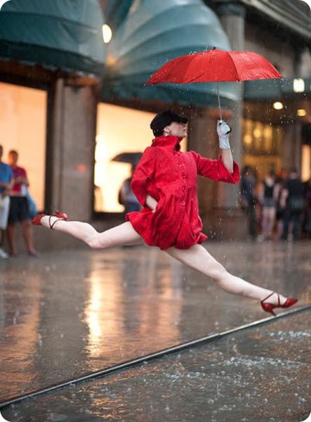 Джордан может сделать до 100 снимков, прежде чем получит желанный кадр. «Чтобы получить этот кадр девушки, танцующей под дождем у магазина «Macy’s», мне потребовалось 96 кадров. Она прыгала на каблуках на мокрой поверхности, а это было нелегко». На фото: Аннмария Маццини у магазина «Macy’s». (JORDAN MATTER PHOTOGRAPHY / BARCROFT USA)