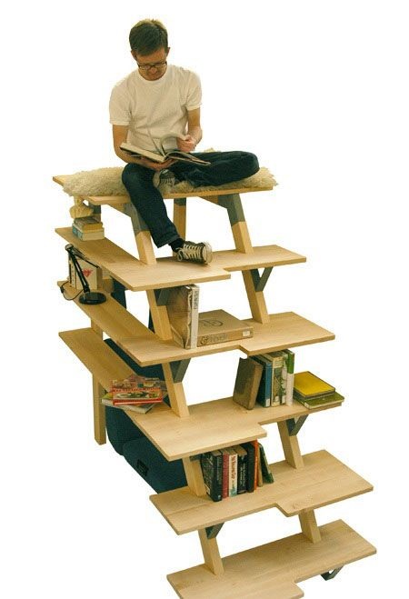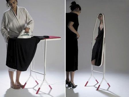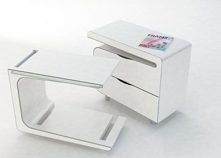 Сервировочный столик на колесах удобно «прячется» внутри конструкции прикроватной тумбочки.