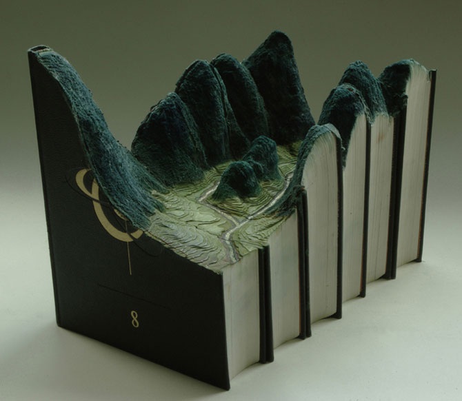 Из них он вырезает настоящие горные ландшафты и плато, затем раскрашивает в природные цвета. По словам автора, ненужные книги со временем превращаются в горы, он только помогает принять им настоящий облик.