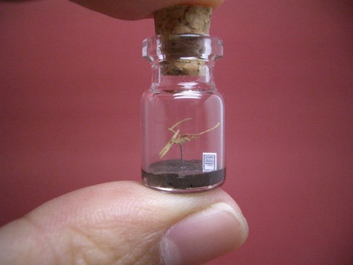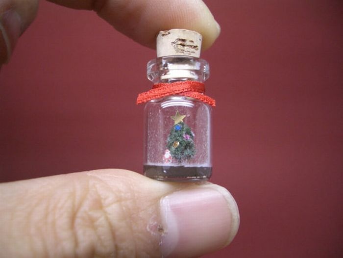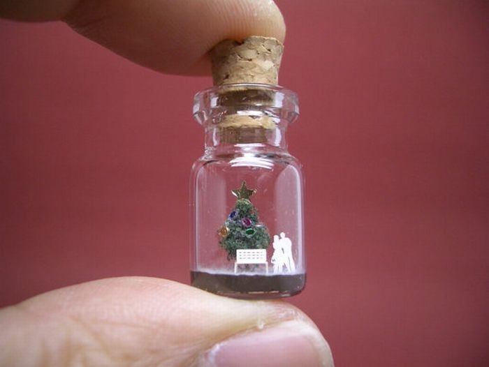 Акинобу Изуму – японский художник, фотограф, создает удивительные миниатюры. Искусство создание миниатюр в пустых бутылках, довольно распространено, этим занимаются тысячи и тысячи людей по всему миру. Однако, Акинобу, в своем проект “Крошечный мир в бутылке”, пошел дальше: он создает миниатюры в очень маленьких бутылочках. Высота бутылочки-колбы, в которой художник создает свои миниатюры, составляет всего лишь 22 миллиметра в высоту и 12 миллиметров в ширину! Это удивительно и невероятно, но Акинобу удается соорудить целый мир. На создание одной миниатюры требуется десятки часов напряженной и кропотливой работы.