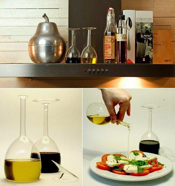 Сервируя столик для романтического ужина в стильной атмосфере современного ресторана, следует избегать фривольных столовых приборов, отдавая предпочтения изысканным и изящным. Именно для такого случая и существуют наборы для масла и уксуса, которые выглядят как перевернутые кверху дном бокалы для вина.
