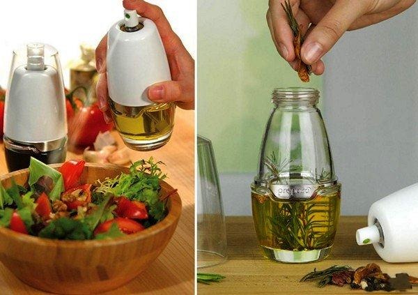 Поскольку приготовление пищи — процесс творческий, было бы неплохо и к заправке для блюд подойти с той же стороны. К примеру, добавить в масло или уксус специй, чтобы придать еде особенный, неповторимый вкус. А затем так же творчески заправить салат, побрызгав его этой смесью из бутылочки-спрея. Будто парфюмом.