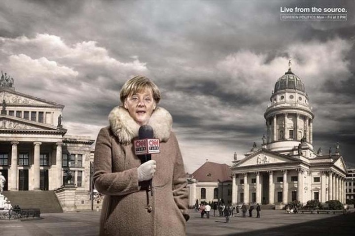 31. Принты рекламной кампании Live from the source для телекомпании CNN, на которых изображены национальные лидеры России, США, Франции и Германии в роли корреспондентов CNN.