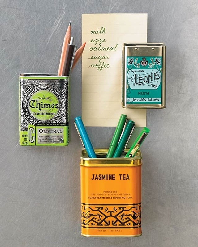 63. Баночки из-под чая и кофе — используя магнит, можно использовать их таким образом, прилепив на холодильник.