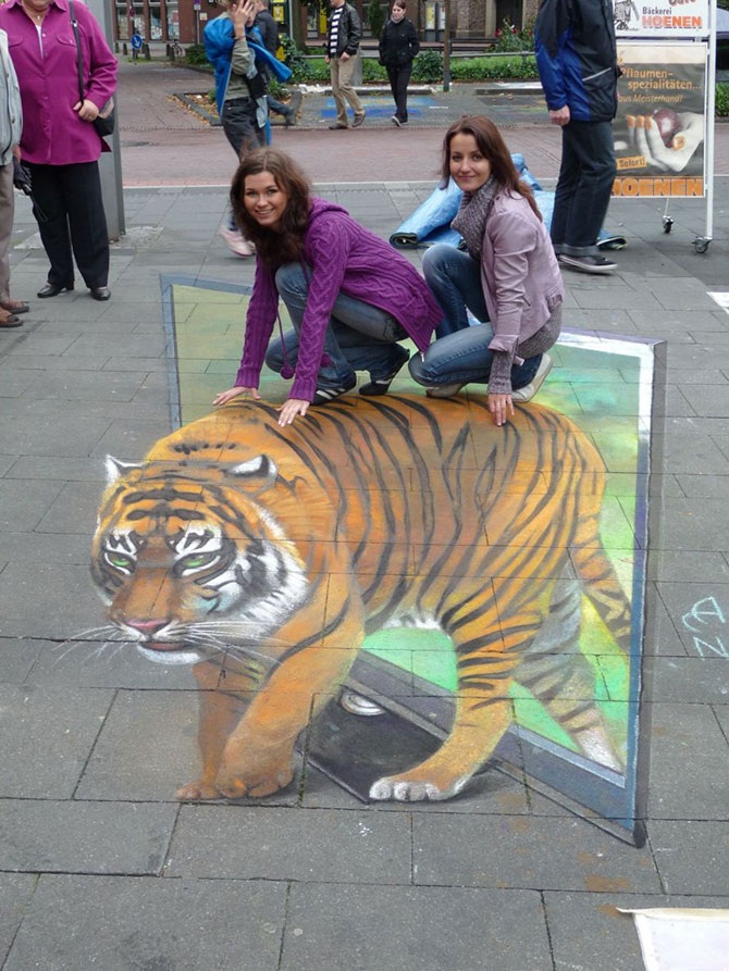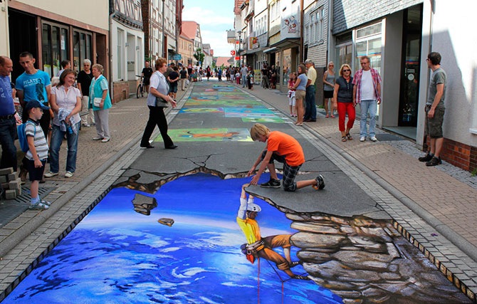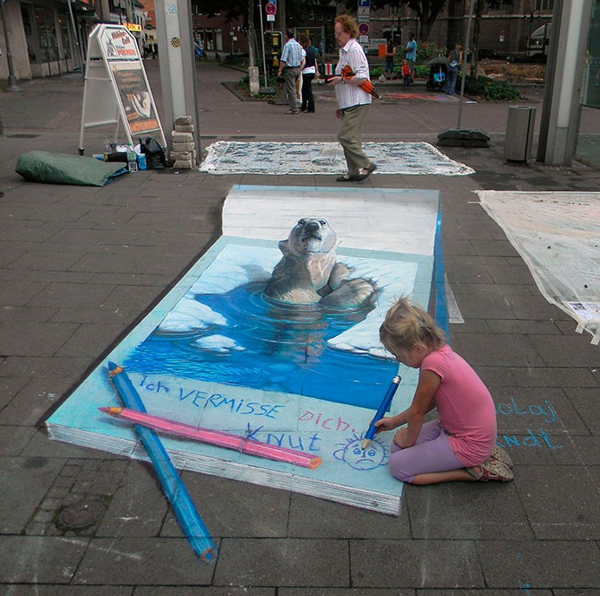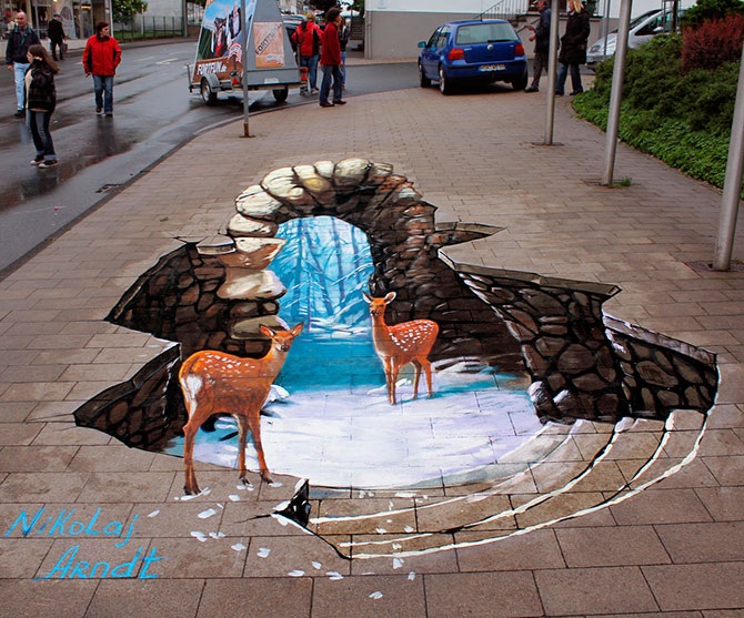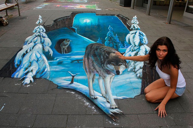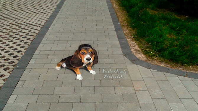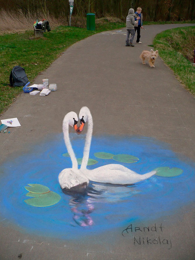 Николай Арндт, до недавнего времени жил и работал в России, точнее, в городе невест Иваново, а сейчас перебрался в Германию, где уличное искусство более популярно. Он не только рисует мелом на улицах городов. В его портфолио есть большое количество традиционных картин.