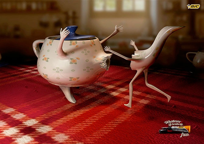 Клей BIC склеивает любые отношения. То, что жизнь ломает, клей BIC склеивает. Идея не нова, но реализация и эмоциональность принта подкупают.
