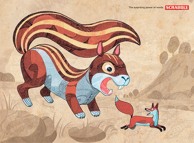 Реклама настольной игры Scrabble, известной в России под названием �Эрудит�. Согласно правилам, слово �белка� принесет игроку больше очков, чем слово �лиса�. Поэтому на принте гигантский грызун гонется за беззащитным хищником. Креатив индийского агентства Ogilvy & Mather.