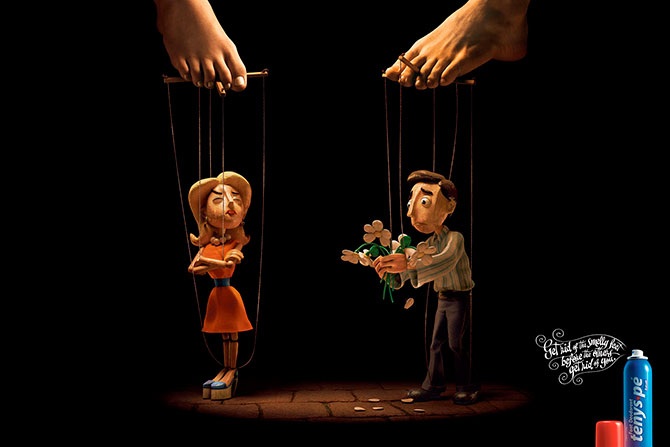 Реклама дезодоранта для ног Baruel. Слоган: �Избавься от неприятного запаха, пока кто-то не избавился от тебя�. Креатив бразильского агентства Z+ Comunicação. Реклама с визуальным трюком: не сразу замечаешь, что марионетками управляют ноги, а не руки.