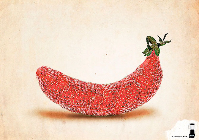 Реклама блендера Kitchen Aid, идеально подходящего для приготовления смузи и прочих фруктовых коктейлей. Один из них представлен на принте в виде экзотического фрукта клубникобанана.