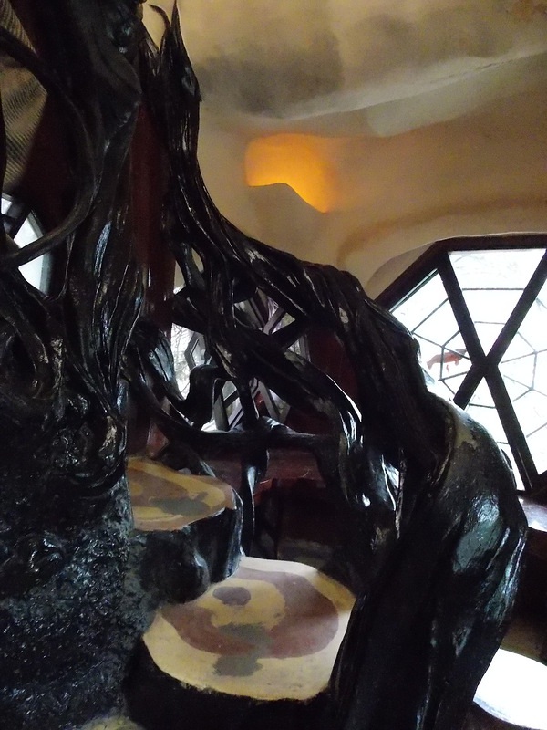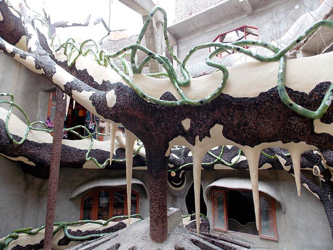 Пещеры, корни деревьев, лианы, лабиринты… Кажется, здесь нет ни одной прямой линии, ни одного прямого угла. Вот переход из одного здания в другое, выкрашенный под корову, да еще и увитый лианами и истекающий молоком…