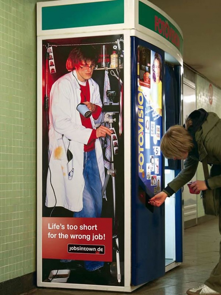 Немецкий сайт для поиска работы Jobisintown.de нестандартно подошел к своей рекламной кампании. Они выпустили серию потрясающих плакатов под общим лозунгом «Жизнь слишком коротка для того, чтобы тратить ее на дурацкую работу». На протяжении нескольких лет креативный сайт представлял публике различные имиджи, объединенные общей идеей: люди, запертые и работающие внутри машин.