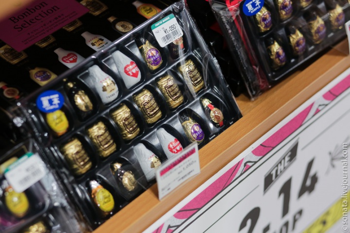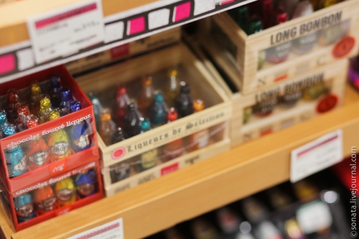 Всякие шоколадные бутылочки с алкоголем. Зеленые — это шоколад со сливовым вином.