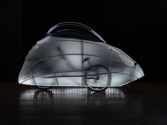 Непогода регулярно вносит свои коррективы в планы любителей экологически чистого транспорта, «намекая» на простудные заболевания и серьезный риск на дороге из-за плохой видимости. Простое решение обеих этих проблем предложили в студии GeoSpace, спроектировав трехколесный велосипед, защищенный прозрачным куполом из полиэтилена. Неспроста названный «Светлячком», этот транспорт имеет привлекающую внимание яркую подсветку и без проблем доставит сухого и невредимого владельца до конечной точки маршрута.