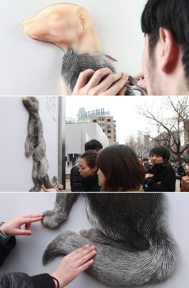 Портреты повесившихся фермеров, выполненные из соломы. Внизу размещен призыв прийти на выставку и купить один портрет. Деньги от продажи портретов поступят семье изображенного фермера. Слоган «Повесьте меня снова».