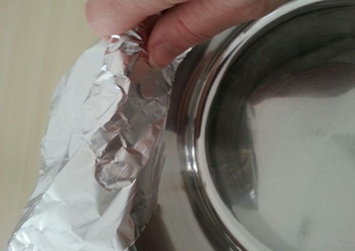 Очистить кастрюли от жира и гари можно с помощью скомканного куска алюминиевой фольги в качестве губки. Не используй этот метод для посуды с тефлоновым покрытием.