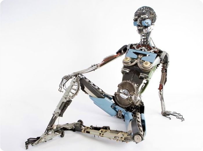 Джереми Майер коллекционирует старые печатные машинки, но суть коллекционирования для него заключается вовсе не в том, чтобы просто выставить их в ряд и показывать друзьям. Вместо этого он разбирает их на запчасти и потом создает из них необычных винтажных существ и фигуры людей-роботов. Такое хобби занимает довольно много времени и требует немало «исходных» материалов: к примеру, на создание этой фигуры человека в натуральную величину потребовалось целых 40 печатных машинок и около 1000 часов работы.