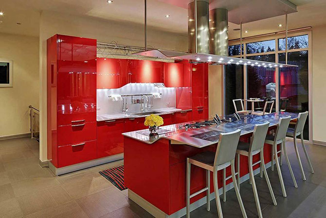 Кухня в дизайне опять перекликается с традиционным цветом дорогих Феррари. Все оформлено в глянцевом красном цвете.