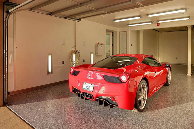 Как и следовало ожидать из гаража открывается вход прямо в гостиную. Дабы всегда наслаждаться зрелищем своих дорогих металлических «коней», стена межу гаражом и гостиной выполнена из стекла.