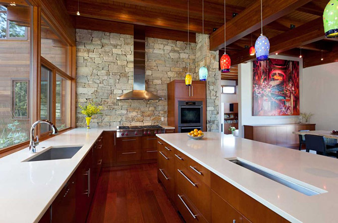 Кухня на первом этаже просто огромна. Её стены облицованы натуральным камнем.