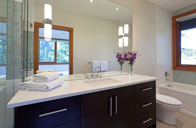 Ванные комнаты также вполне просторны и их них также можно видеть горы.