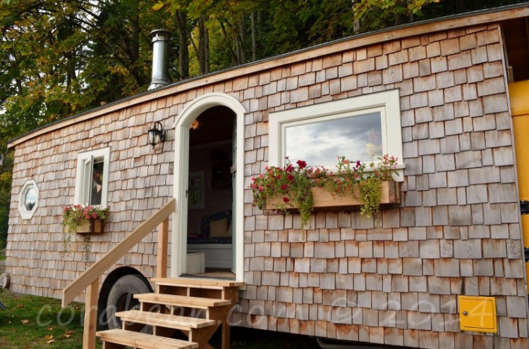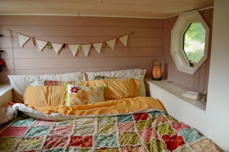 На месте колес находится милый диванчик и печь, которая и обогревает всё помещение.