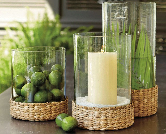 ПРИВЕДЕМ ПРИМЕР. Три вазы разной высоты. Основные материалы одинаковые — ивовые прутья и стекло. Но есть различия в элементах наполнения — песок, вода и плоды лайма».