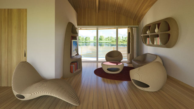 Площадь дома, получившего называние “водное гнездо” составляет 93 квадратных метра. Построен он целиком и полностью из вторично переработанных лесоматериалов и повторно использованного алюминия. Дом использует электричество от солнечных батарей на крыше.