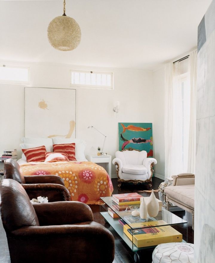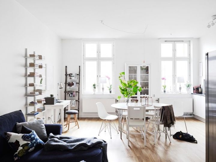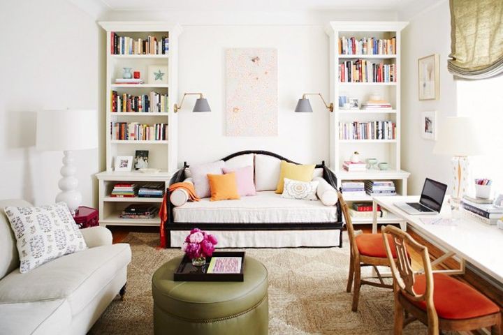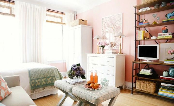 Да, стены лучше оставить белыми, но это не означает, что стоит вовсе отказаться от ярких цветов в дизайне квартирки-студии. Оставьте цветные акценты таким мелочам, как одеяло на кровати или накидка и диванные подушки.