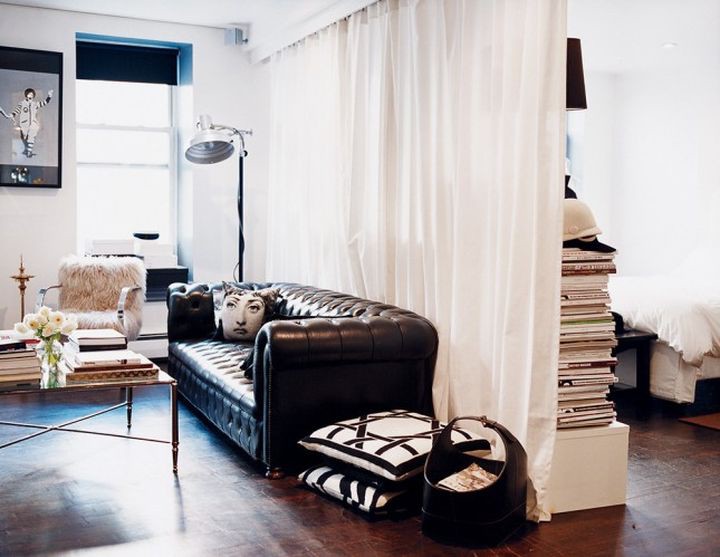 Этой светлой и вполне просторной (в мире квартир-студий, конечно) комнатке просто нечего скрывать.