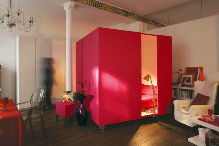 Это не просто стеклянные стены, это настоящий куб с кроватью внутри посреди вашей гостиной. Очень оригинально и явно уютно.