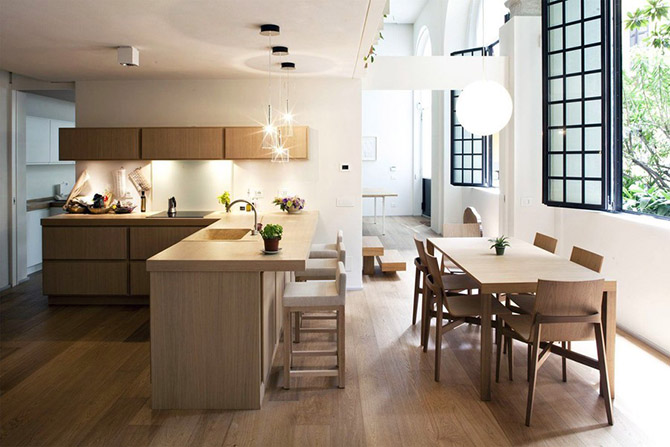 Когда светлая кухонная мебель плавно и незаметно перетекает в такой же по цвету, материалу и фактуре пол, то складывается ощущение гармонии и единства, а этого порой так не хватает.