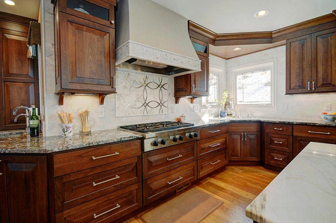 Вне всяких сомнений, классическая кухня смотрится роскошно, но любителям подобной мебели из натурального дерева следует помнить, что для маленькой комнаты такой вариант не совсем уместен. Ведь помещение будет казаться еще меньше и теснее.