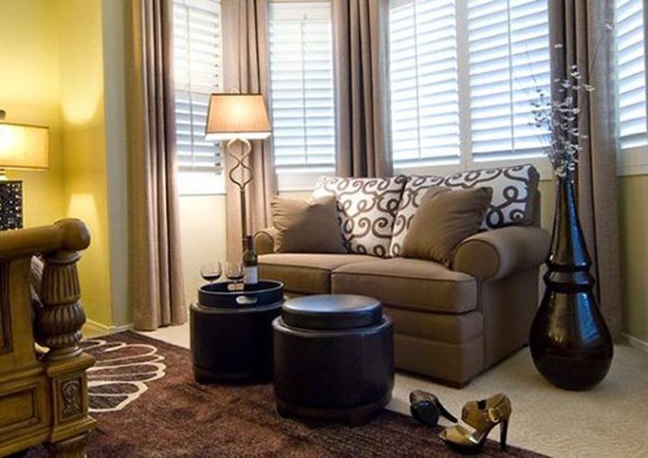 Лучше разместите в дальнем углу комнаты какой-то яркий или крупный предмет декора (торшер или напольное кашпо с зеленью) – появится эффект большой перспективы, и комната будет казаться просторнее. Обратите внимание: вытянутые вверх предметы декора зрительно увеличивают высоту комнаты.
