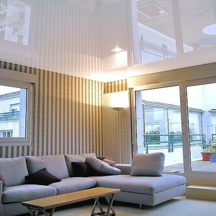 Гладкая лакированная поверхность зрительно приподнимает потолок и придаёт ему дополнительную глубину. Кстати, светильники, встроенные в глянцевый потолок, также визуально делают пространство шире.