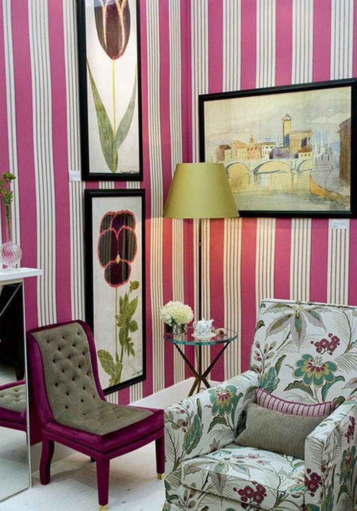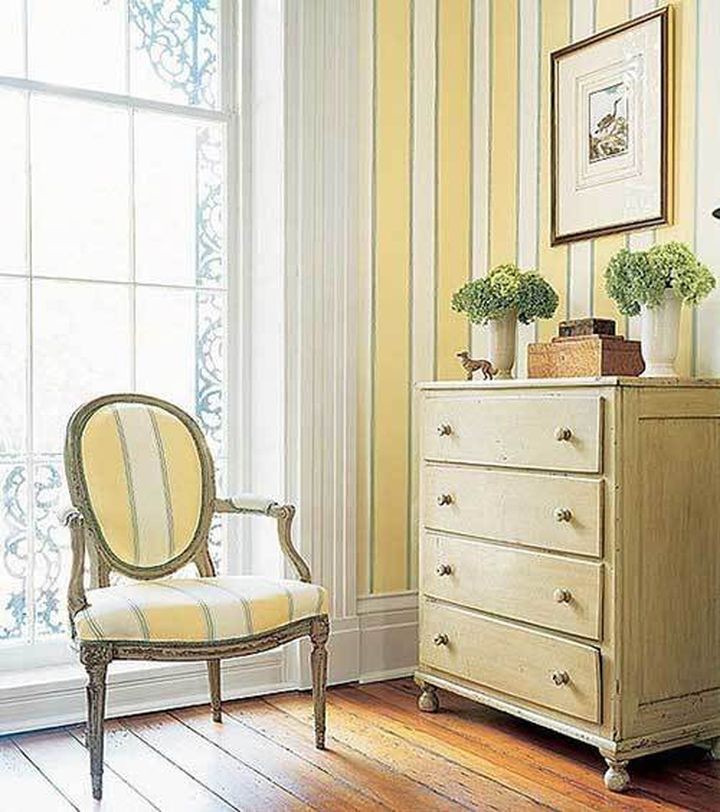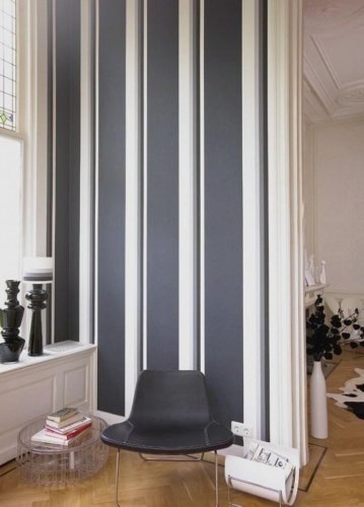 Высоту помещения можно зрительно увеличить с помощью обоев в полоску. Однако чтобы избежать агрессивного впечатления от геометрического рисунка обоев, применять их нужно на одной-двух стенах комнаты.