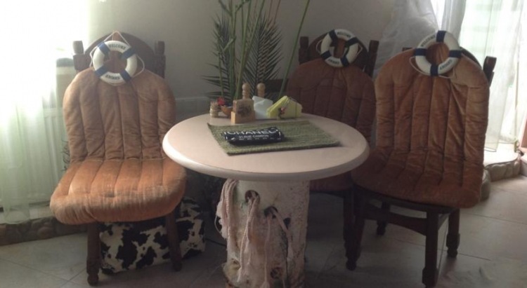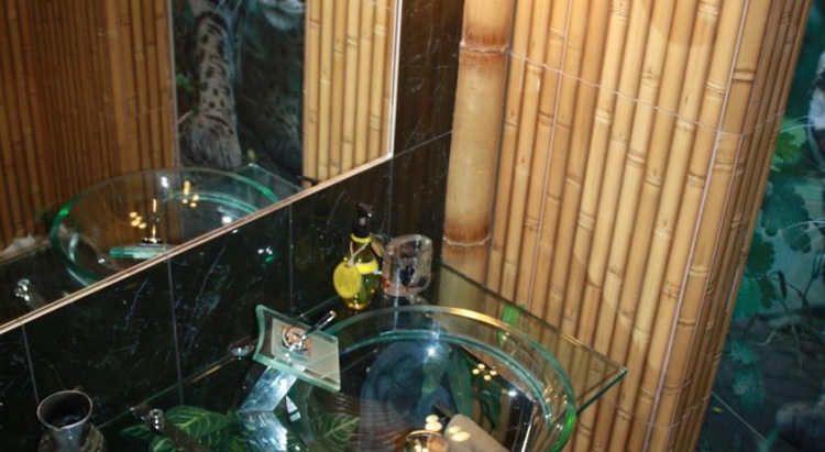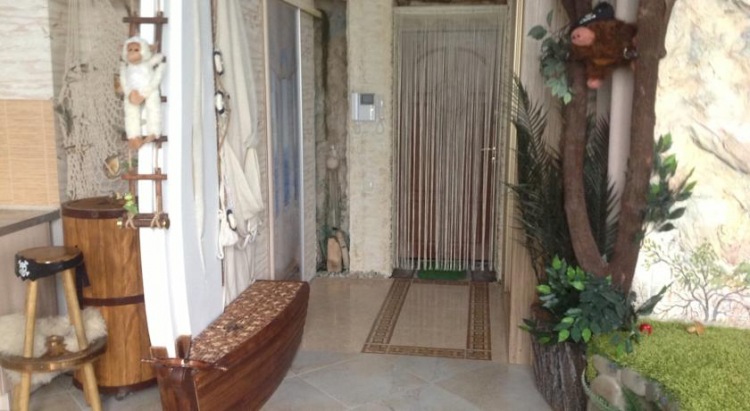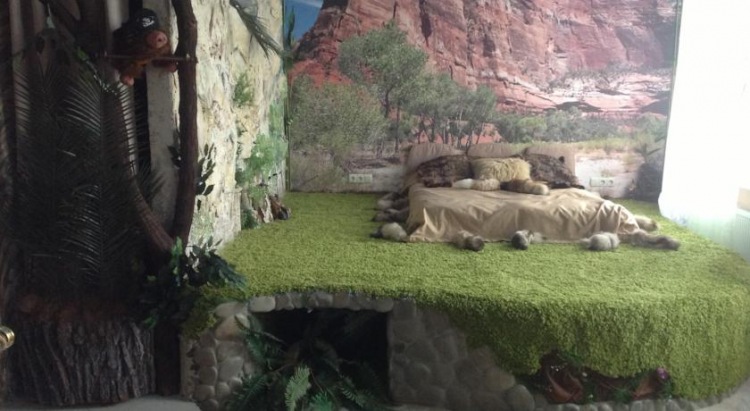 Начнем с самого сладкого – спальни! Подиум, обитый искусственным газоном, на котором лежит матрас, украшенный плюшевыми хвостами енотов! На стене фотообои, вокруг – пластиковые пальмы! Если много выпить, то можно подумать, что засыпаешь в лесу!