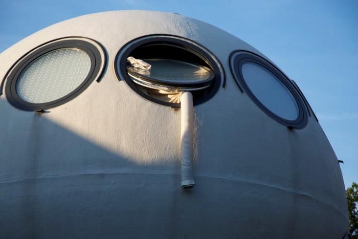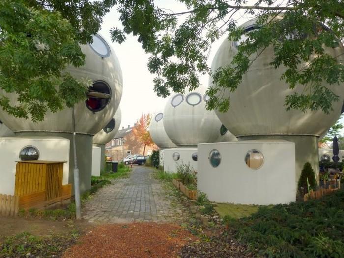 Шары диаметром 5,5 метра выполнены из бетона и стекловолокна. У домов своеобразная планировка, в центре шара расположена ванная комната и маленькая спальня. Кухня и гостиная находятся на втором уровне. Кстати эти дома мобильные, всего за один день его можно разобрать и перевезти на любое место.