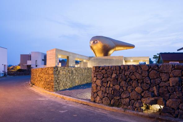 На известном вулканическом острове-курорте на юге Кореи архитектурное бюро «Moon Hoon» спроектировало комплекс резиденций. Среди трех вилл выделяется дом владельца – его венчает скульптура в виде клюва золотого цвета. Хотя некоторые утверждают, что скульптура больше на похожа на женские волосы, развевающиеся от ветра. Как бы то ни было, комплекс резиденций получил имя «Wind houses».