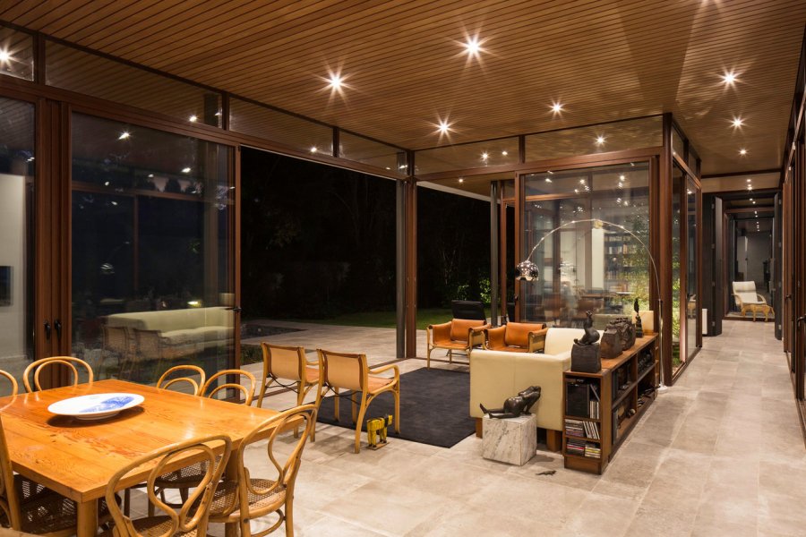 Две стены в доме выполнены стеклянными, поэтому кажется, что внутреннее пространство и сад образуют одно целое. Пол из камня и потолок из дерева хорошо сочетаются с бетоном и сталью несущих конструкций. Линейная планировка подразумевает свободный доступ в сад из каждой комнаты. Исключения составляют лишь технические помещения и санузлы, а также кухня, выполненные закрытыми и обособленным от остальных функциональных зон открытого плана.