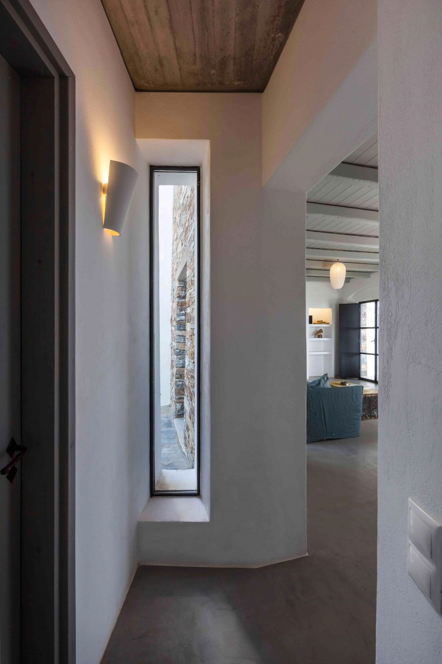 Жилой комплекс из четырёх отдельных зданий расположен на наклонном участке с оливковыми деревьями и видом на залив в Центральной Греции. Главное строение имеет два этажа, а все остальные остаются одноярусными.