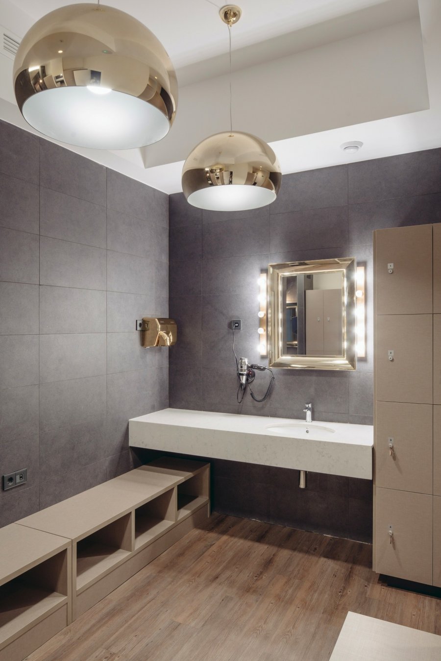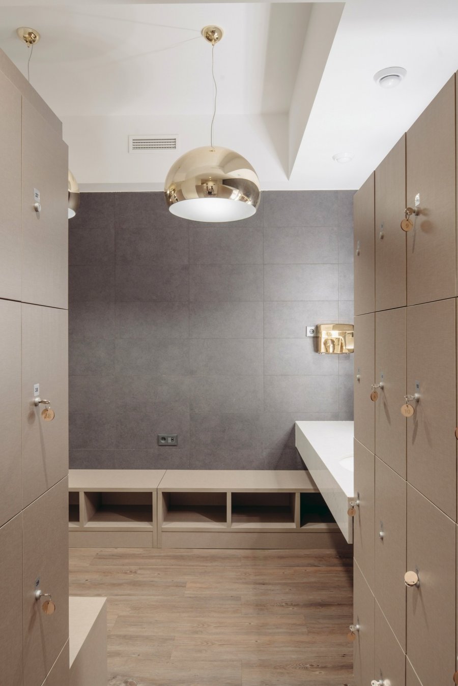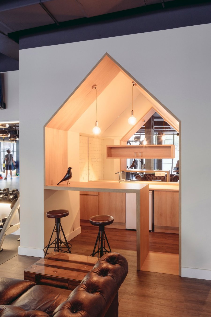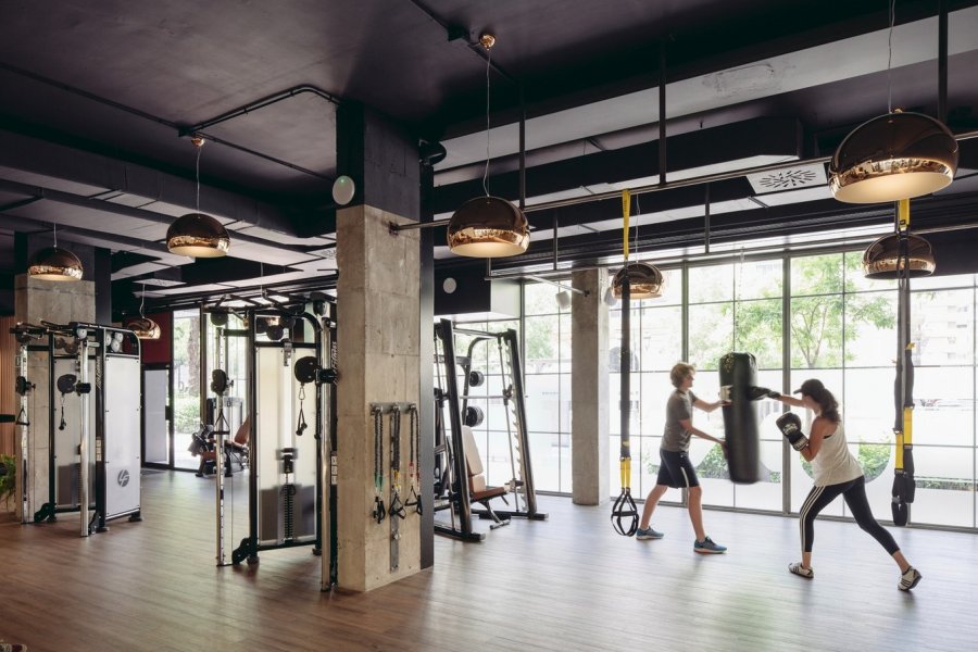 Высокое помещение открытой планировки освещено большими окнами, дающими мягкий непрямой свет. Свисающие на длинных шнурах блестящие лампы напоминают атмосферу музыкального клуба. Свободно стоящие тренажёры предоставляют клиентам много личного пространства.