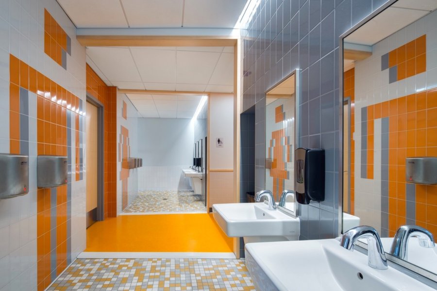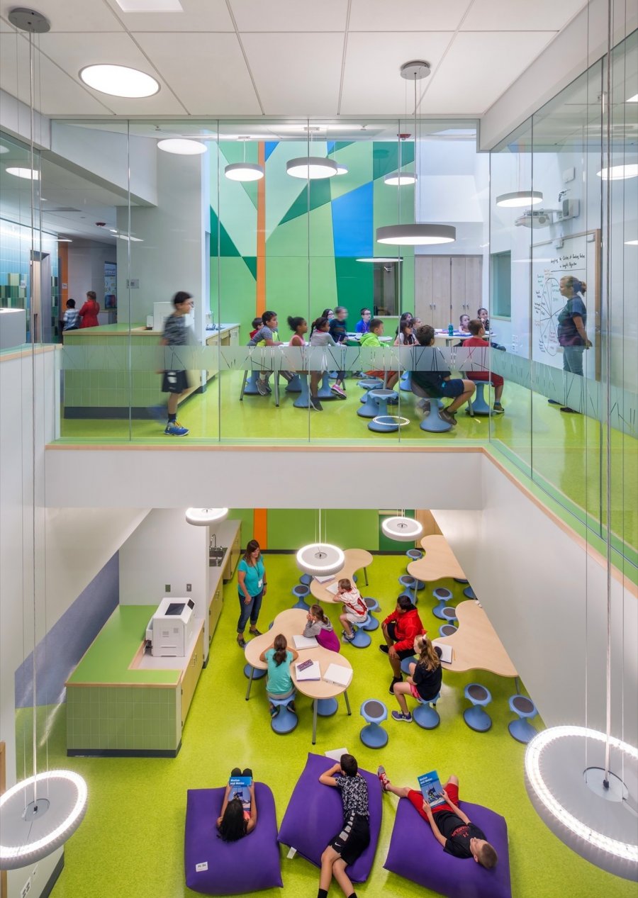 Конструктивной основой учебного корпуса школы, предназначенной для 3–5 классов, стало деление пространства в соответствии с учебными потоками. Классы каждого года обучения занимают один этаж крыла здания, они сгруппированы в три меньших кластера, в каждом из которых, в свою очередь, расположено по шесть учебных кабинетов и общее пространство за пределами классов. Это медиа-зоны, амфитеатры, круговые комнаты для бесед и помещения для множества других видов деятельности, дающие возможность осуществлять разнообразные гибкие подходы к обучению. В проектные зоны включены умывальники, чтобы проводить «грязные» практические занятия. Педагоги могут легко переходить от работы в классе к большим массовым мероприятиям, групповым проектам или рабочим сессиям малых групп в смежных учебных помещениях.