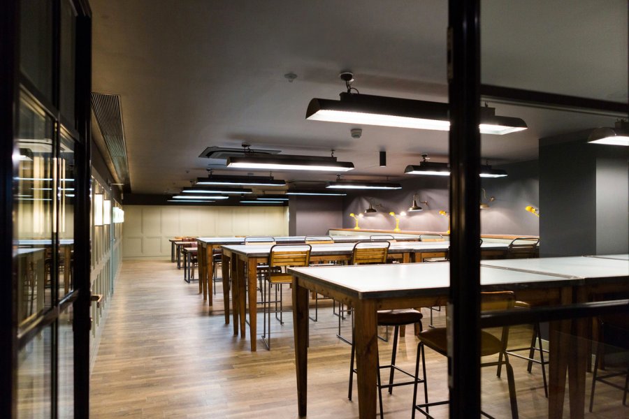 Архитекторы увеличили доступ в вестибюль дневного света, открыв существующие антресоли и добавив стеклянные перегородки в стальных рамах. Была установлена новая лестница из стали и дерева с ограждением из металлической сетки; металлические элементы интерьера повторяются и в консольном освещении. Среди других дополнений, которые принесла с собой реконструкция — кинозал и зоны для занятий, индивидуальные и совместные, оформленные общими длинными столами и высокими стульями.