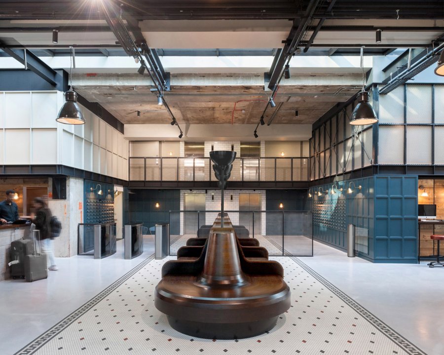 Вестибюль напоминает зал прибытия вокзала, с его высоким бетонным потолком, металлическими балками и изогнутыми деревянными скамейками. Стены облицованы керамической плиткой, участки пола покрыты мозаикой. Обитые мягкой тканью диваны вызывают в памяти сидения купейного вагона. Расположенные в разных местах здания диваны и ковры предлагают удобные островки для отдыха и общения. Совместная кухня располагает пространством, где студенты могут приготовить еду и перекусить.