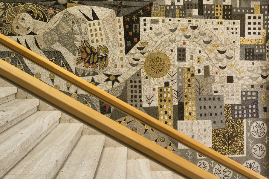 Голландская студия KAAN Architecten переехала в новый офис в Роттердаме (Нидерланды), проект интерьера которого сама же и разработала. De Bank, новая штаб-квартира фирмы площадью 1400 квадратных метров, заняла здание Нидерландского банка 1950 годов постройки. Его кирпичный фасад отчётливо выделяется на фоне силуэта городской набережной. Отличительной чертой здания является вестибюль, украшенный мозаикой голландского художника Луи ван Рооде, активно работавшего в Роттердаме в послевоенный период.