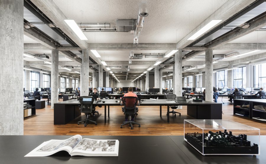 Обширное пространство включает в себя более 80 рабочих мест. Ядро офиса образует большая общая рабочая зона с тремя рядами длинных столов. Расположенные с обеих сторон высокие окна обеспечивают пространство обилием света и открывают вид на набережную.