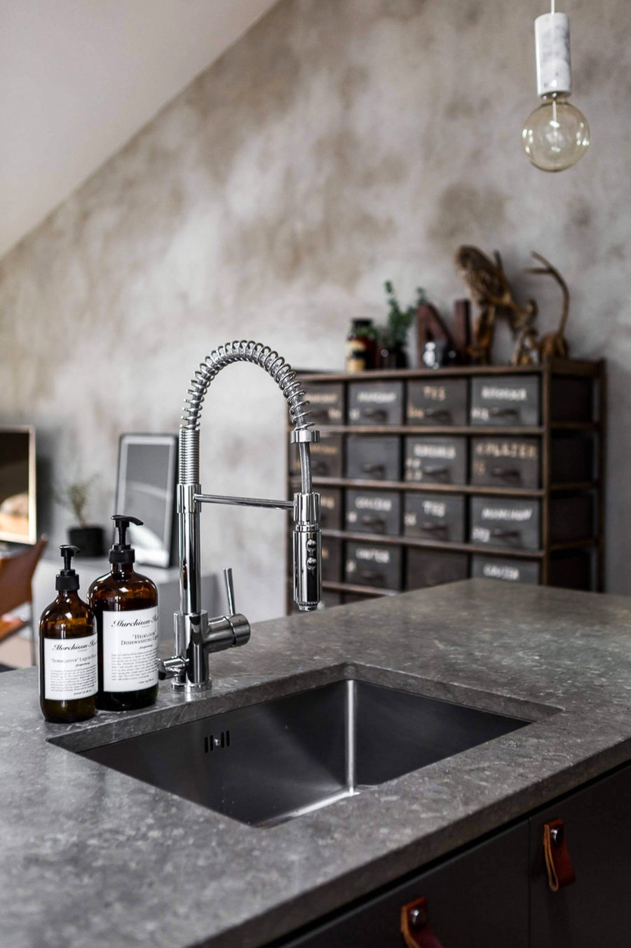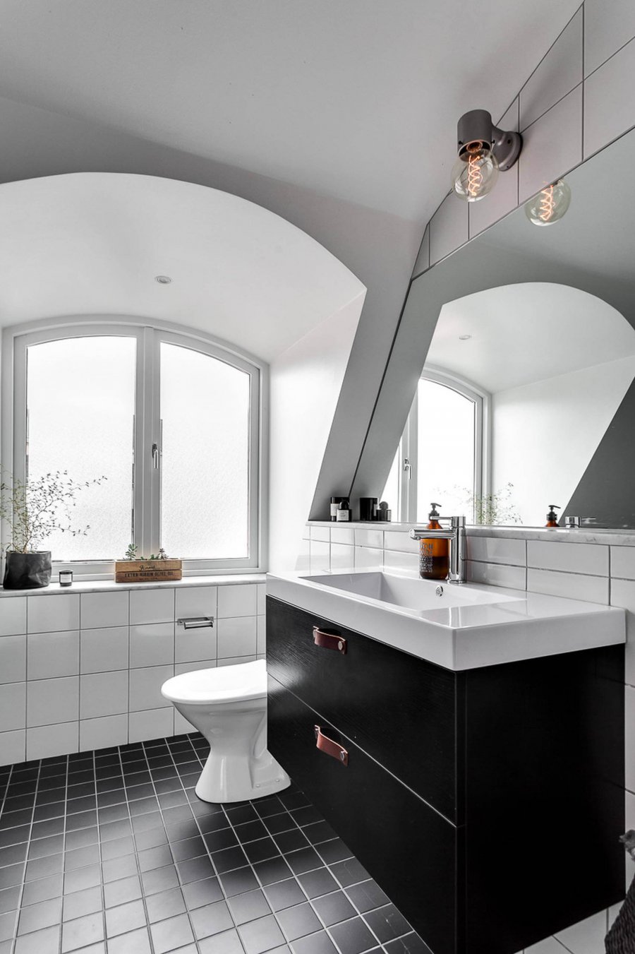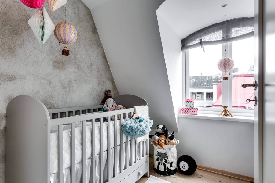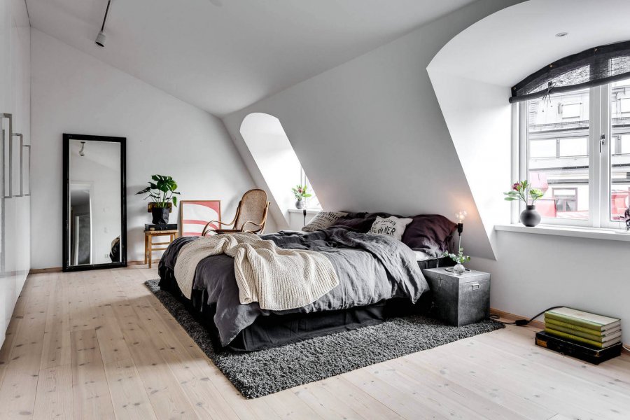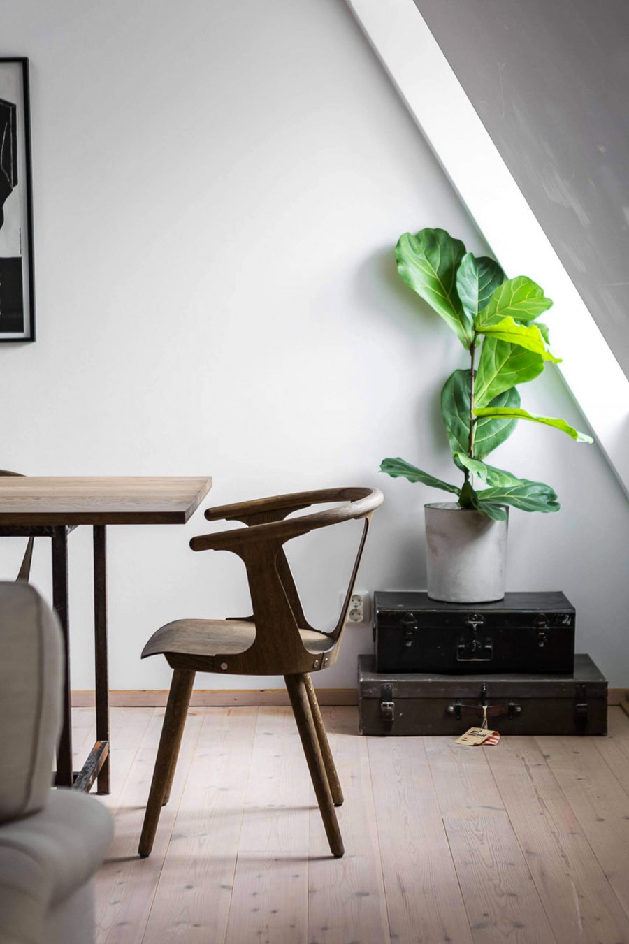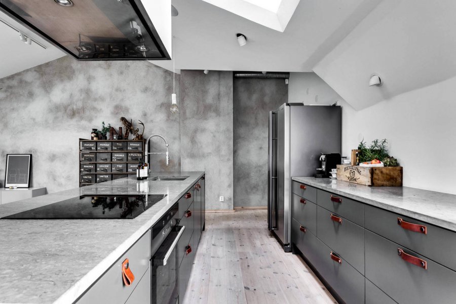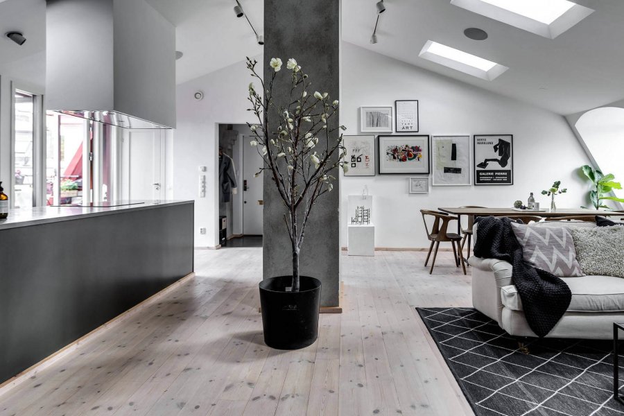 Просторная гостиная открытой планировки, включающая в себя зоны кухни и столовой, отличается чистотой простых форм и обилием гладких ровных поверхностей. Сочетание белых стен и стен, покрытых шероховатой серой штукатуркой, высокий мансардный потолок со световыми фонарями придают квартире лёгкий лофтовый характер, а комнатные растения в горшках, мягкий диван с обилием подушек, ковёр с геометрическим узором, присутствие тёплых фактур дерева возвращают интерьер в родной скандинавский контекст. Винтажные предметы и стильные детали, такие, как кожаные ручки шкафов кухни и ванной, вносят завершающие штрихи в неповторимую атмосферу этой элегантной резиденции.