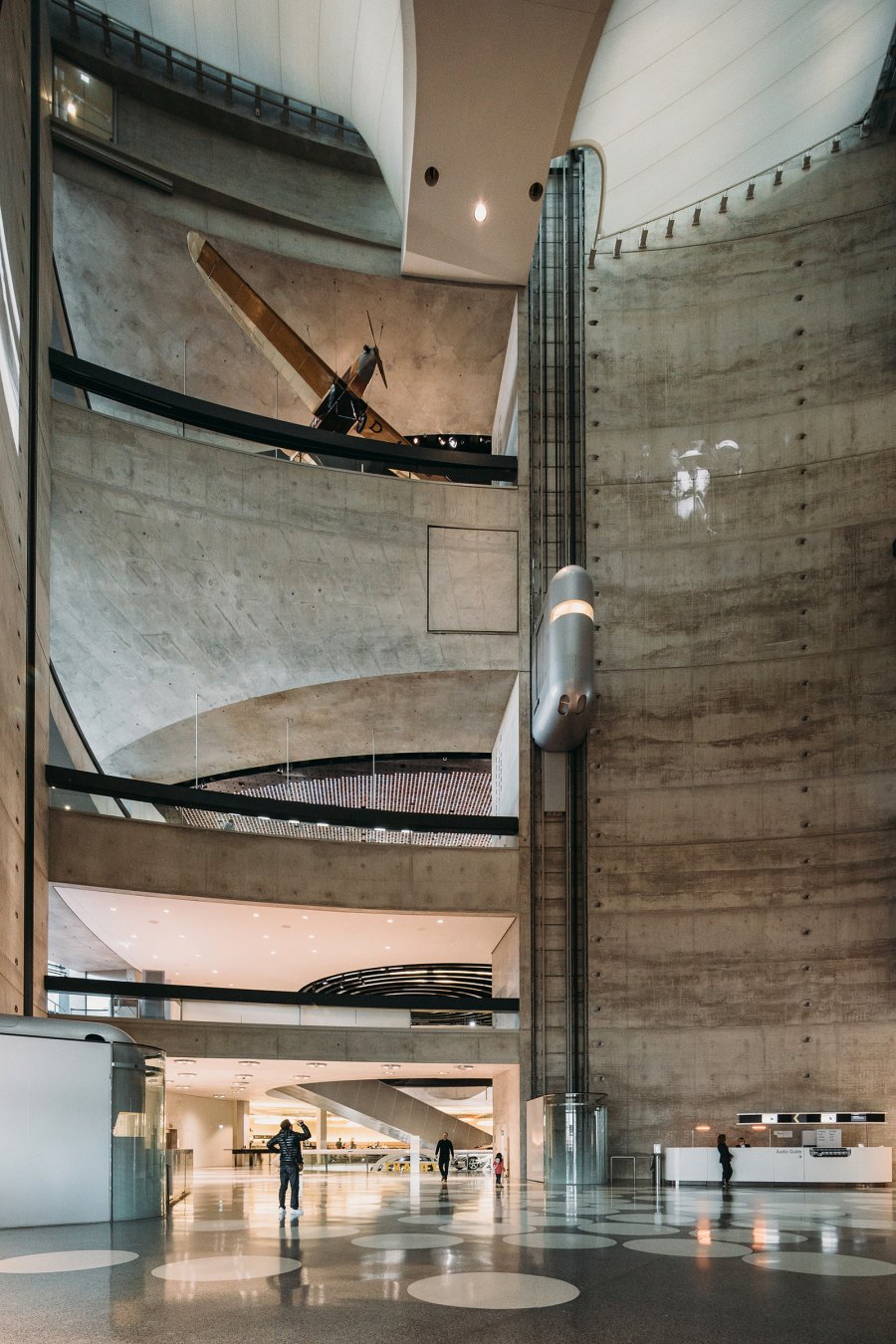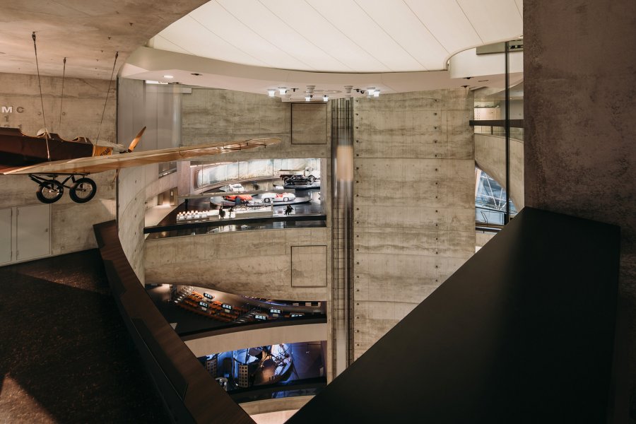 Пространство здания организовано вдоль поверхностей, полого поднимающихся от нижнего уровня и обвивающихся вокруг центрального атриума. Из цокольного этажа посетители на лифте поднимаются на вершину здания, откуда начинают знакомство с музеем. Две спирали пандусов, ведущих вниз, предлагают два пути следования, вдоль одного из которых экспонируется коллекция автомобилей, а вдоль другого разворачивается выставка, знакомящая с историческим контекстом создания машин. Соединённые системой мостиков и переходов, два этих маршрута многократно пересекаются, предоставляя людям возможность выстраивать свою траекторию движения.