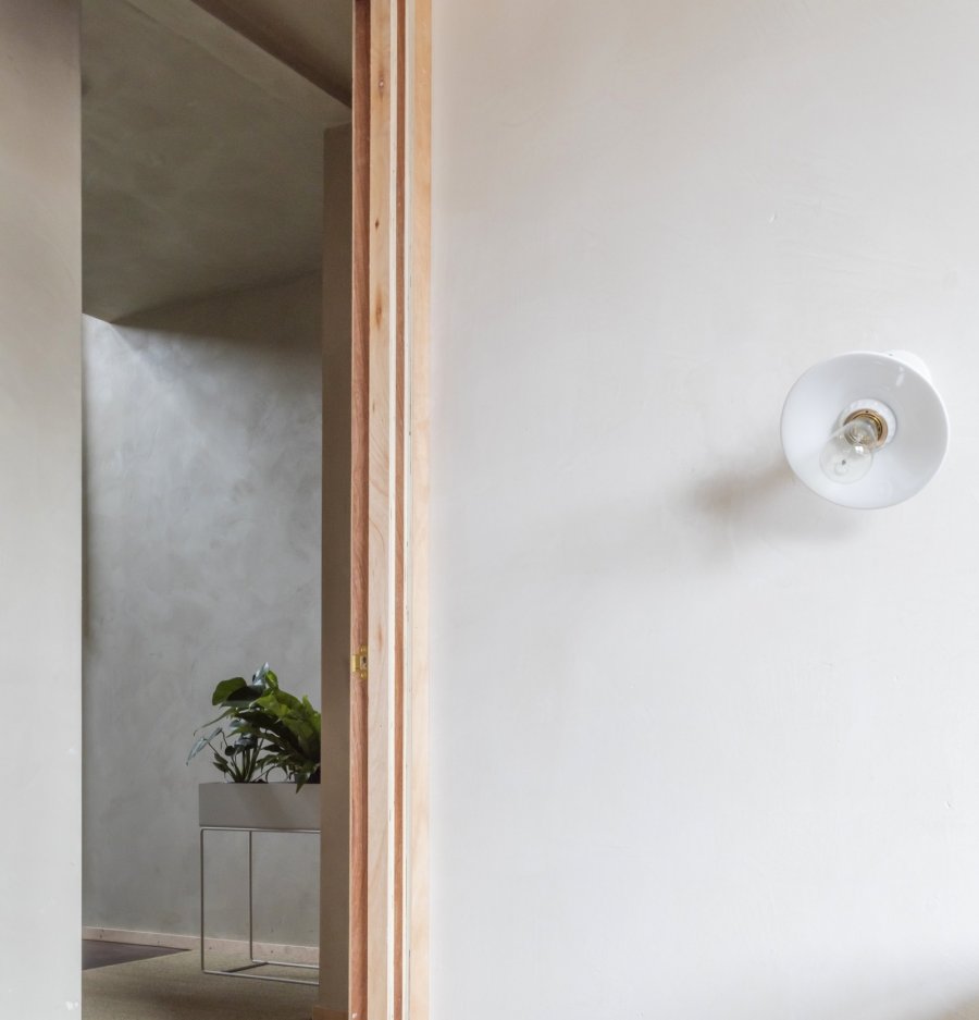 Глина — экологичный материал, контролирующий влажность дома и обеспечивающий здоровую жилую среду с антибактериальным эффектом. Глина придаёт стенам красивую фактуру, которой невозможно добиться специальным декорированием, а также напоминает традиционную отделку японского дома arakabe, ведь заказчик проекта японского происхождения.