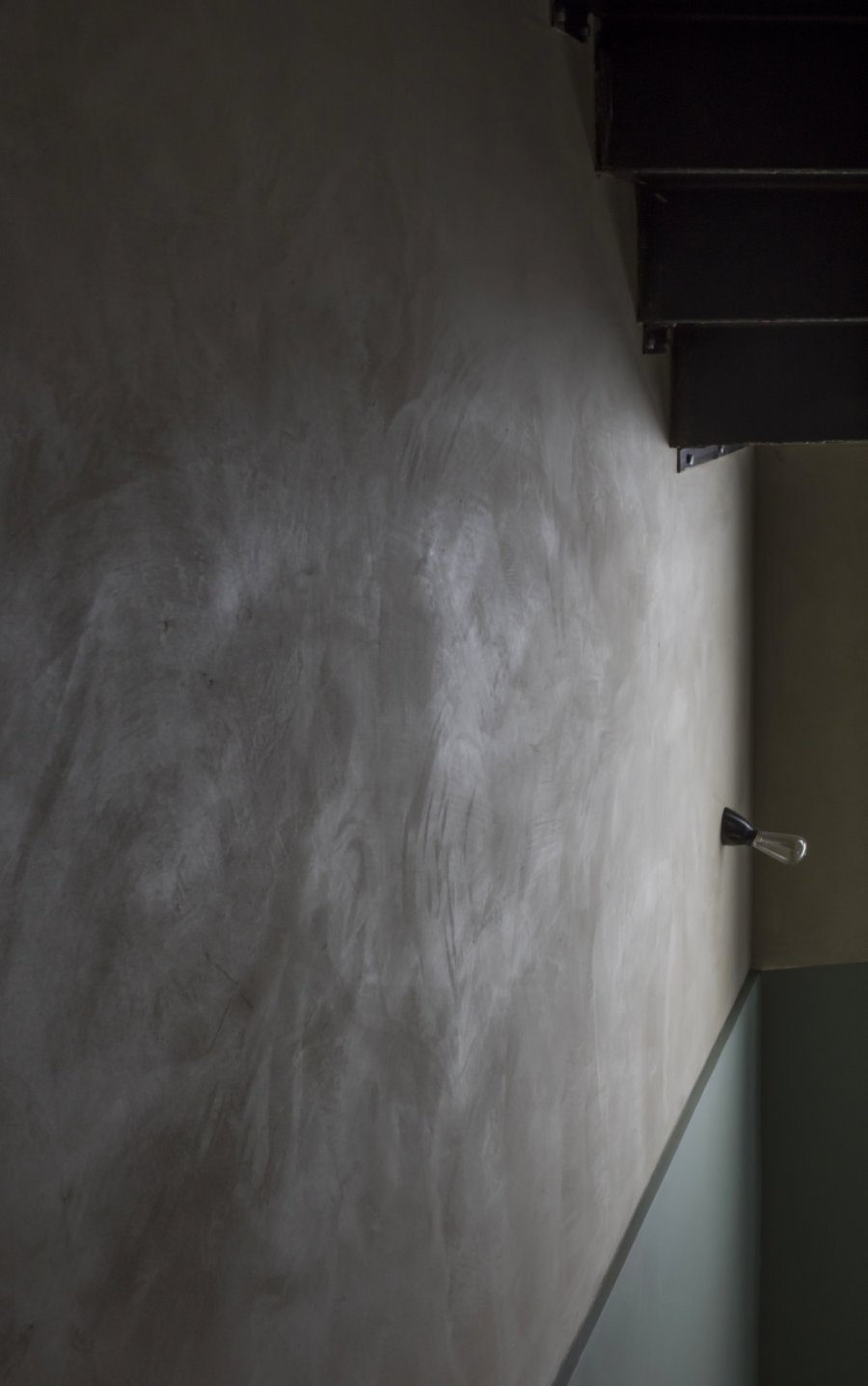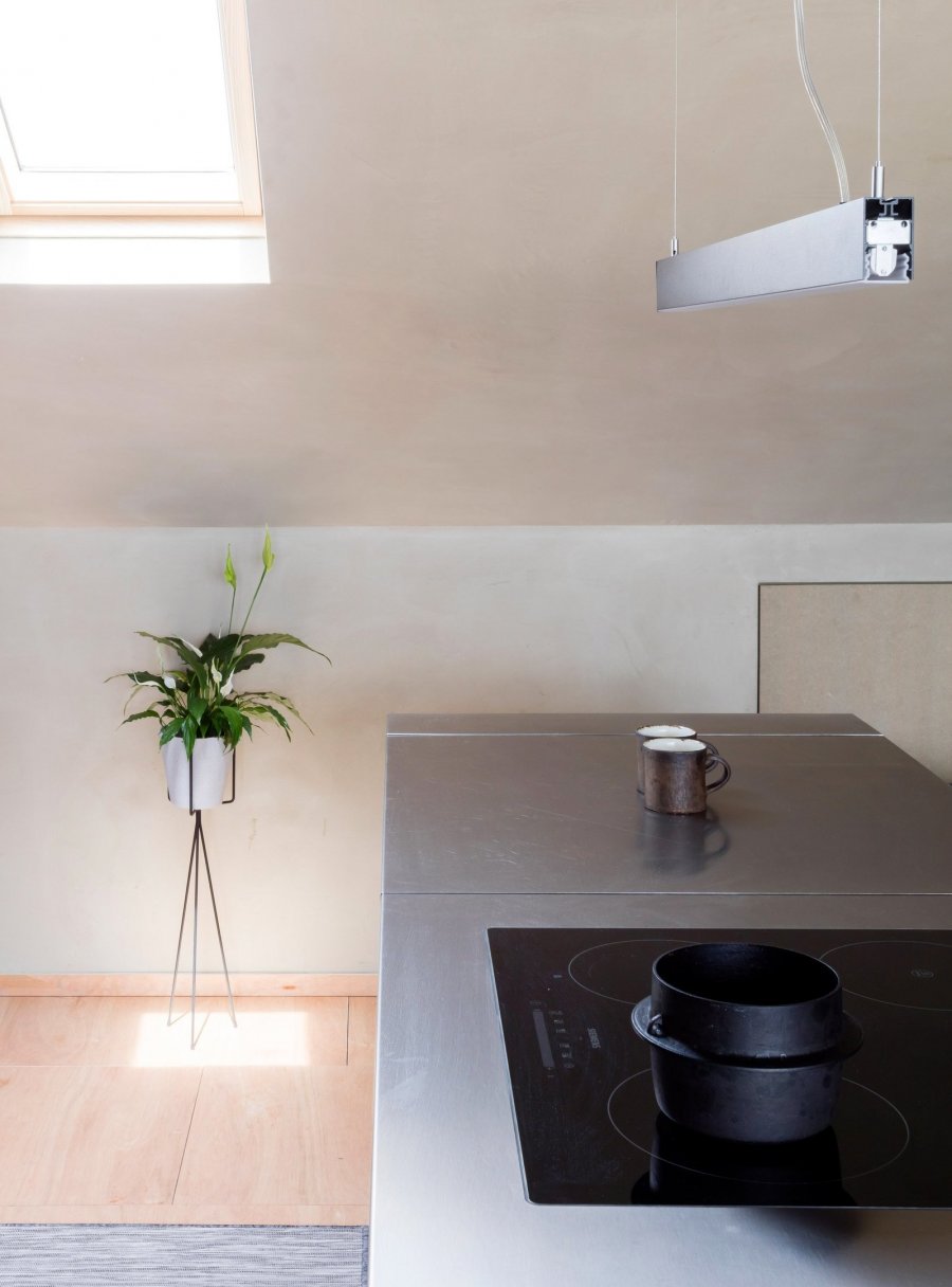 Особое внимание архитекторы уделили зоне ванной, которая была спроектирована самым тщательным образом в соответствии с пожеланиями владельца квартиры. После пересечения глиняной гостиной вы попадаете в промежуточную зону с циновкой на полу, откуда можно попасть собственно в ванную. Эта часть помещения отделана панелями из морёного дуба; простая раковина из строительной стали, отмеченной следами предыдущего использования, резко отличается от привычной белоснежной сантехники и призвана напоминать о ходе времени. Медные краны из Лиссабона добавляют ощущения суровой аутентичности этому пространству. За стеклянным экраном находятся ванна и душ. Здесь облицовка выполнена из серого фарфора. К балкам прикреплены цветочные горшки, растения в которых получают влагу от испарений ванной комнаты.